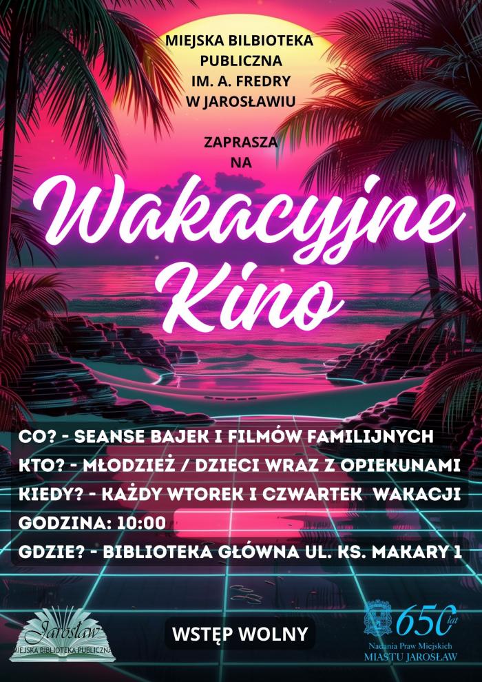 Projekcja bajek i filmów familijnych dla dzieci i młodzieży w każdy wtorek i czwartek wakacji w Miejskiej Bibliotece Publicznej w Jarosławiu.