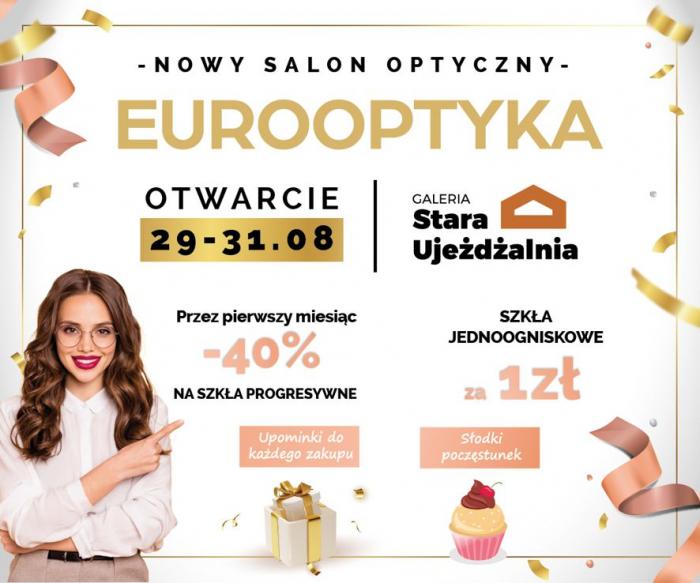 Otwarcie nowego Salonu Optycznego EUROOPTYKA w Galerii Stara Ujeżdżalnia w Jarosławiu. Przyjdźcie w dniach od 29 do 31 sierpnia. Przez pierwszy miesiąc czekają na Was promocje i rabaty. Da każdego zakupu upominki, a dla Wszystkich odwiedzających salon słodki poczęstunek.