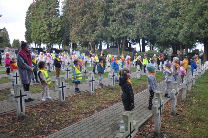 Pięciolatki i sześciolatki z Niepublicznego Przedszkola AKADEMIA UŚMIECHU w Jarosławiu w poniedziałek, 31 października, dzień przed uroczystością Wszystkich Świętych odwiedziły groby jarosławskich bohaterów w kwaterze wojennej na Nowym Cmentarzu