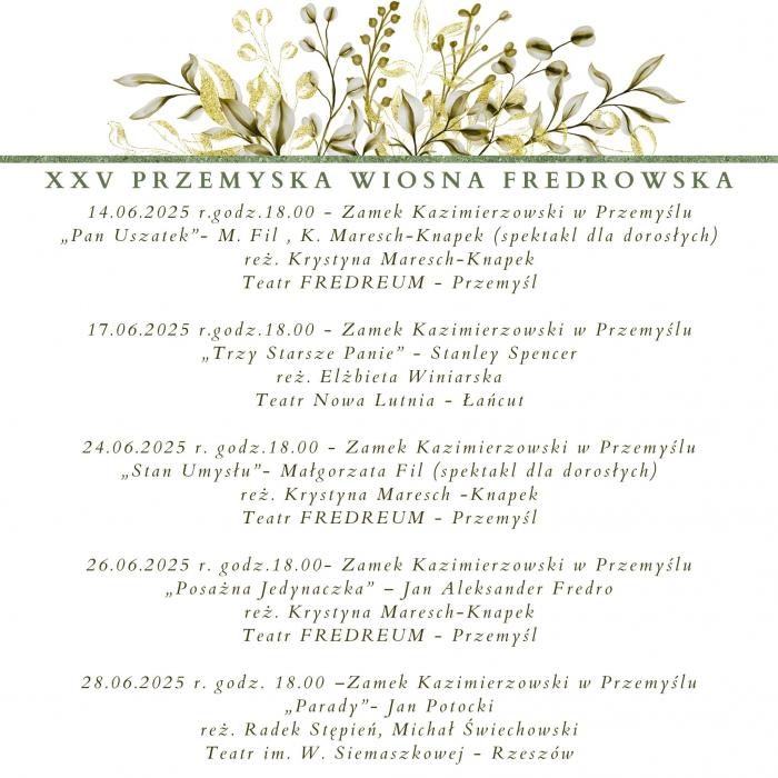 W czerwcu odbędzie się XXV Przemyska Wiosna Fredrowska – cykliczne święto miłośników Melpomeny organizowane przez Teatr Fredreum w partnerstwie z Przemyskim Centrum Kultury i Nauki ZAMEK. Od 14 do 28 czerwca widzowie będą mogli obejrzeć aż pięć różnorodnych spektakli.