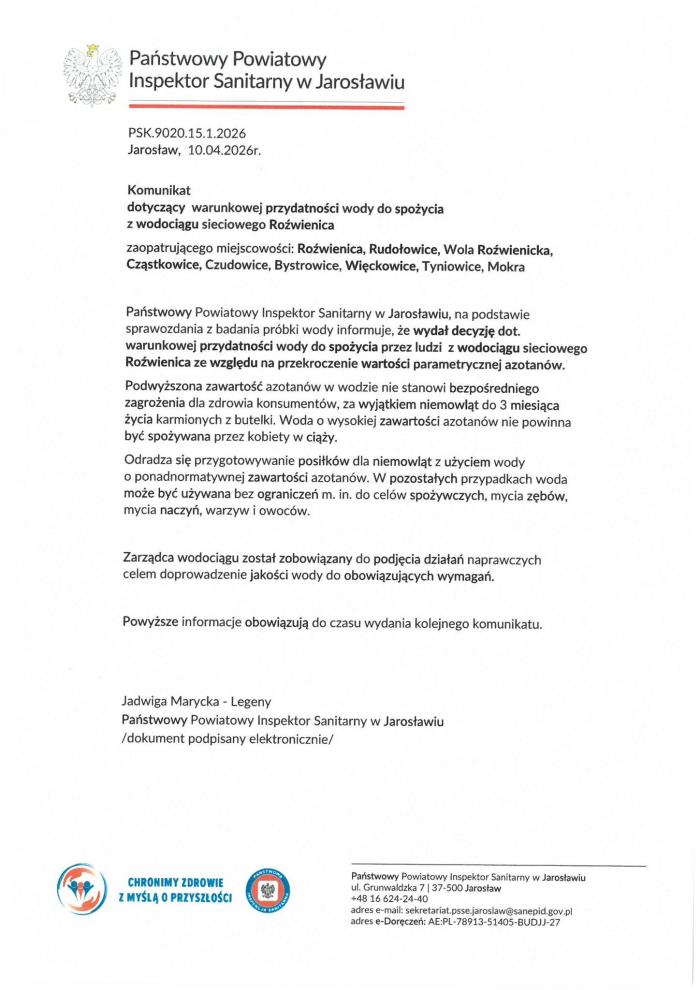 Na podstawie sprawozdania z badania próbki wody Państwowy Powiatowy Inspektor Sanitarny w Jarosławiu poinformował, że wydał decyzję dotyczącą warunkowej przydatności do spożycia przez ludzi wody z wodociągu sieciowego Roźwienica ze względu na przekroczenie wartości parametrycznej azotanów.