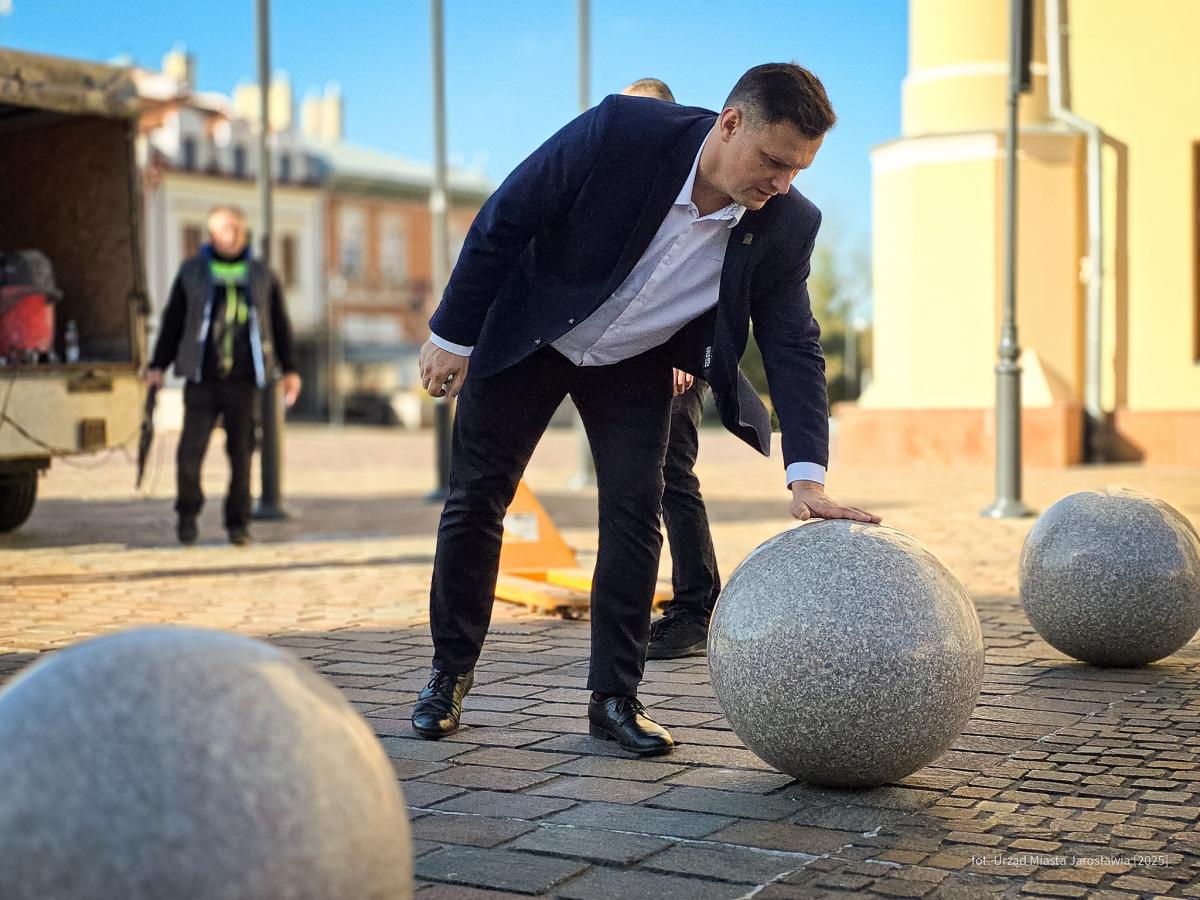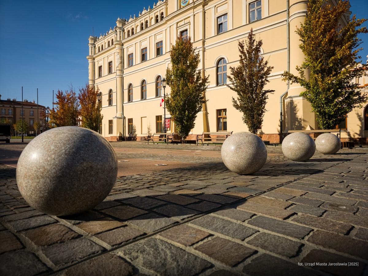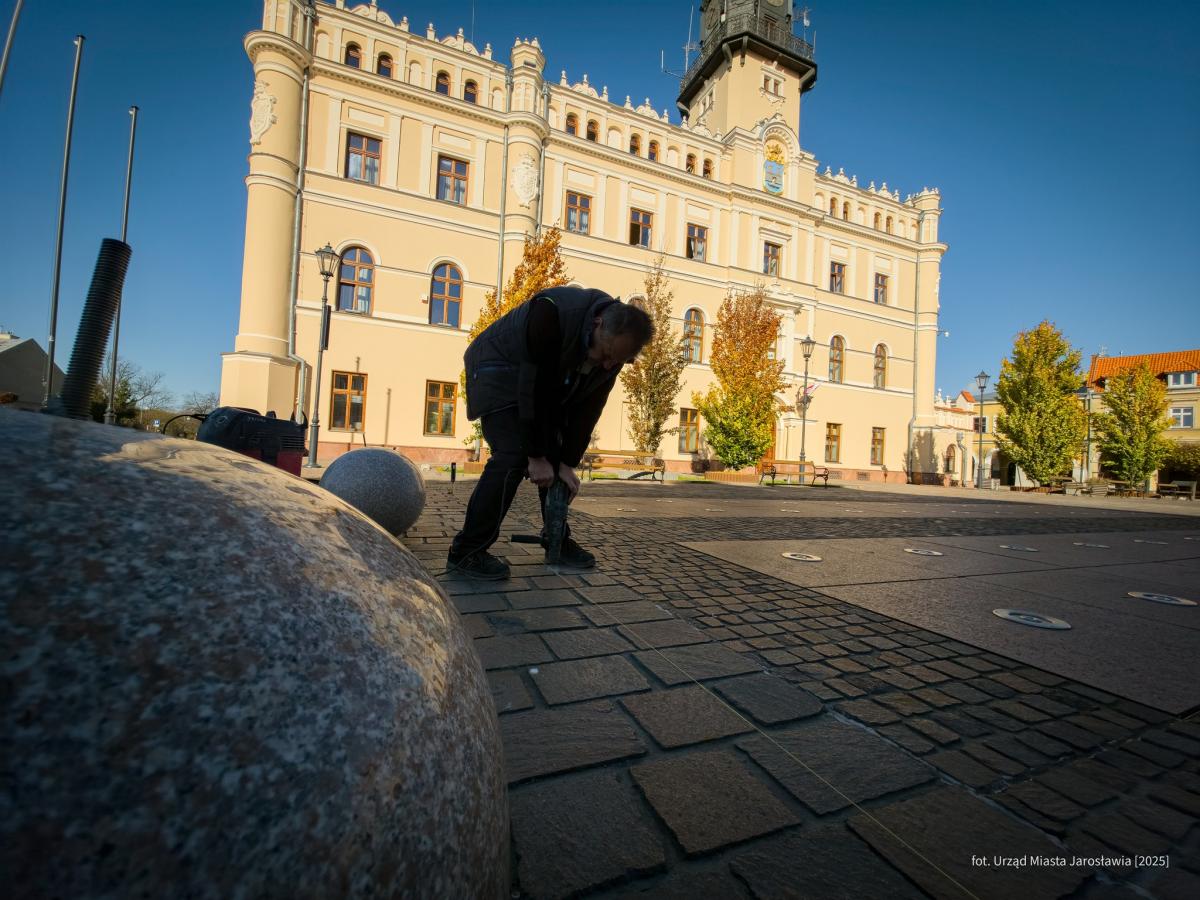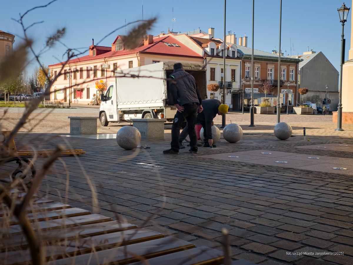 Zdjęcia prezentują kule, które swoją barwą nawiązują do kolorystyki brukowanej płyty Rynku. Kotwy pewnie je przytwierdzają do podłoża. Kule nie tylko ozdabiają przestrzeń, ale także chronią fontannę przed wjazdem pojazdów, zwiększając jej bezpieczeństwo. Zdjęcia autorstwa UM Jarosław.