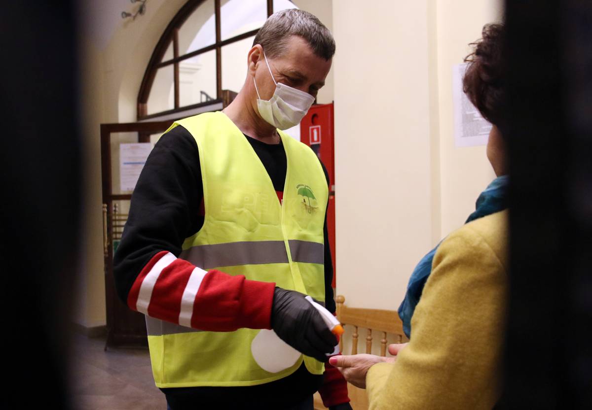 Wchodząc do ratusza, musisz poddać się pomiarowi temperatury i zdezynfekować ręce