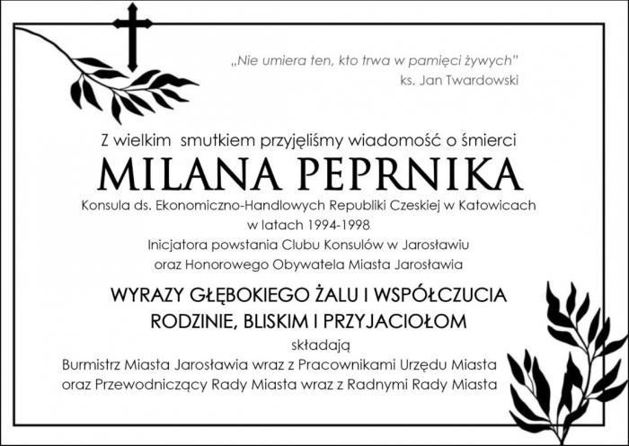 Milan Peprnik zmarł 17 grudnia. Różaniec w intencji zmarłego zostanie odmówiony 27 grudnia, o godz. 11.30, w kościele pw. Męczeństwa Św. Jana Chrzciciela w Łaziskach Średnich koło Katowic. Msza św. żałobna odprawiona zostanie o godz.12.00, a po Mszy św. nastąpi złożenie trumny do grobu na cmentarzu parafialnym.